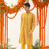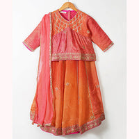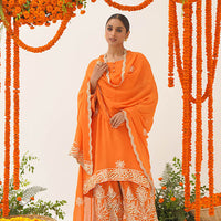 Tanveera Gota Work Salwar Set, a splendid trio tailored for the festive spirit. The ensemble features a mesmerizing blue kurta adorned with self-sequence and intricate thread work. Complementing this is a blue salwar embellished with gold brocade floral patterns, exuding an elegant charm. The ensemble is beautifully contrasted with an orange georgette dupatta featuring delicate Gota patti work, making it ideal for the joyous festivities. Elevate your style and embrace the celebration with the enchanting Salwar Set.